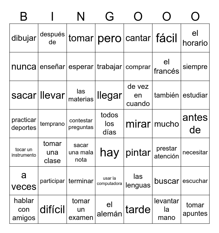 This bingo card has a free space and 48 words: las lenguas, el francés, el alemán, temprano, las materias, antes de, después de, difícil, fácil, hay, el horario, pero, también, de vez en cuando, a veces, mucho, nunca, siempre, buscar, cantar, comprar, contestar preguntas, dibujar, enseñar, escuchar, esperar, estudiar, hablar con amigos, llegar, llevar, levantar la mano, mirar, necesitar, participar, practicar deportes, pintar, prestar atención, sacar, sacar una mala nota, terminar, tocar un instrumento, tomar apuntes, tomar, tomar un examen, trabajar, usar la computadora, tomar una clase and tarde.