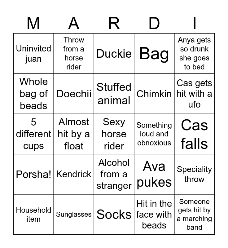 This bingo card has a free space and 28 words: Speciality throw, 10 glass beads, Chimkin, Hit in the face with beads, Whole bag of beads, Duckie, Throw from a horse rider, Porsha!, Something loud and obnoxious, Household item, 5 different cups, Bag, Sunglasses, Socks, Cas gets hit with a ufo, Anya misses the beginning of the parade, Kendrick, Doechii, Stuffed animal, Alcohol from a stranger, Uninvited juan, Matt tries to pick something off of the floor, Someone gets hit by a marching band, Almost hit by a float, Cas falls, Ava pukes, Anya gets so drunk she goes to bed and Matt picks anya up.