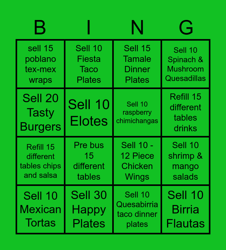 This bingo card has 16 words: Sell 10 Mexican Tortas, Sell 30 Happy Plates, Sell 15 Tamale Dinner Plates, Sell 10 Spinach & Mushroom Quesadillas, Sell 20 Tasty Burgers, Sell 10 Fiesta Taco Plates, Sell 10 - 12 Piece Chicken Wings, Sell 10 shrimp & mango salads, sell 15 poblano tex-mex wraps, Sell 10 Elotes, Sell 10 Quesabirria taco dinner plates, Refill 15 different tables drinks, Refill 15 different tables chips and salsa, Pre bus 15 different tables, Sell 10 raspberry chimichangas and Sell 10 Birria Flautas.