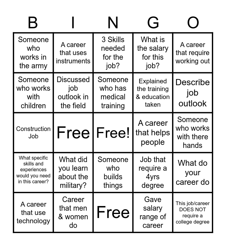 This bingo card has a free space and 24 words: What did you learn about the military?, Career that men & women do, Someone who has medical training, A career that use technology, A career that require working out, Someone who works in the army, Someone who works with children, A career that uses instruments, A career that helps people, Someone who builds things, Explained the training & education taken, Construction Job, Job that require a 4yrs degree, What do your career do, Discussed job outlook in the field, Gave salary range of career, Someone who works with there hands, 3 Skills needed for the job?, Describe job outlook, Free, This job/career DOES NOT require a college degree, What specific skills and experiences would you need in this career?, What is the salary for this job? and Free.