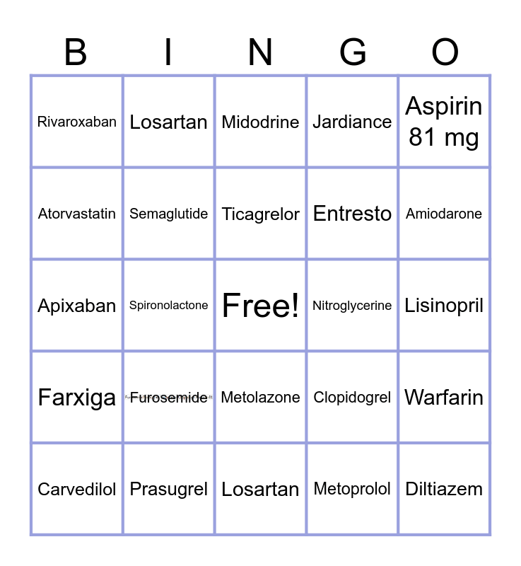 This bingo card has 1 images, a free space and 24 words: Furosemide, Prasugrel, Ticagrelor, Carvedilol, Aspirin 81 mg, Rivaroxaban, Atorvastatin, Losartan, Nitroglycerine, Metolazone, Entresto, Apixaban, Clopidogrel, Warfarin, Semaglutide, Metoprolol, Lisinopril, Midodrine, Amiodarone, Spironolactone, Diltiazem, Farxiga, Jardiance and Losartan.