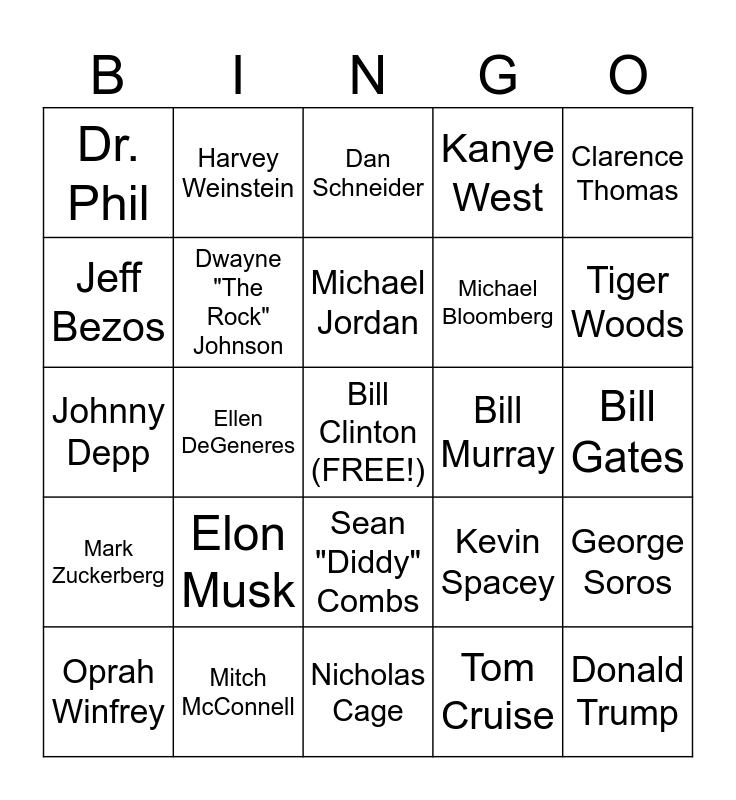This bingo card has a free space and 24 words: Elon Musk, Mitch McConnell, Michael Jordan, Oprah Winfrey, Clarence Thomas, Dr. Phil, Jeff Bezos, Harvey Weinstein, Bill Murray, Sean "Diddy" Combs, Michael Bloomberg, Johnny Depp, Kevin Spacey, George Soros, Dwayne "The Rock" Johnson, Tom Cruise, Bill Gates, Dan Schneider, Tiger Woods, Ellen DeGeneres, Donald Trump, Mark Zuckerberg, Kanye West and Nicholas Cage.