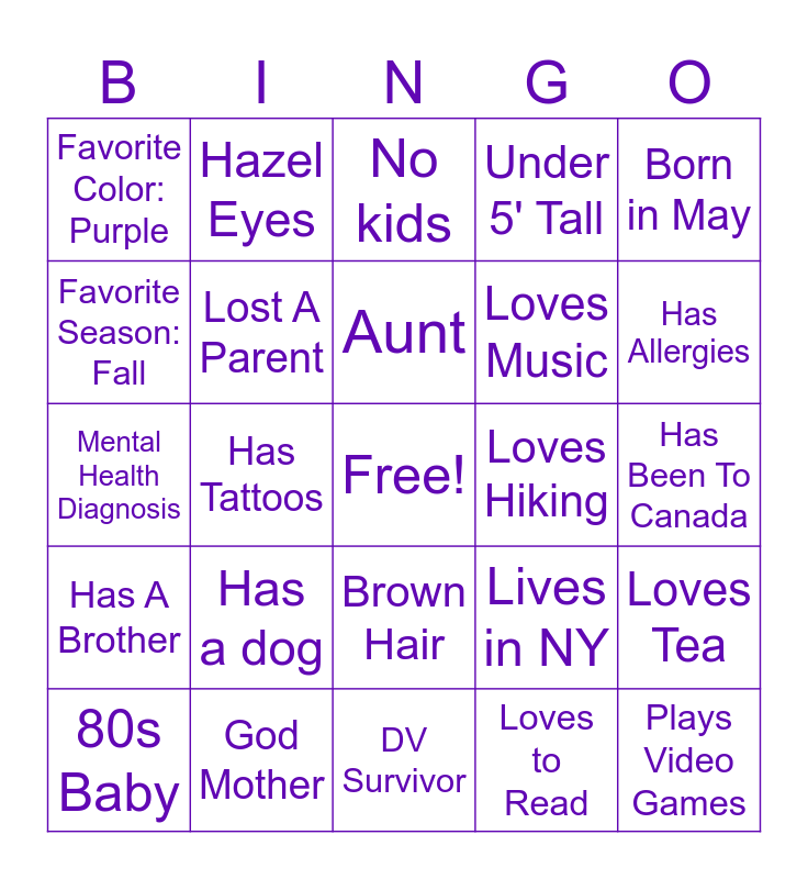 This bingo card has a free space and 24 words: Has a dog, God Mother, Aunt, 80s Baby, Born in May, Favorite Color: Purple, Favorite Season: Fall, Hazel Eyes, Loves Hiking, Brown Hair, Loves Music, Mental Health Diagnosis, Lives in NY, Loves Tea, Lost A Parent, Loves to Read, Has Been To Canada, No kids, Has Allergies, Has Tattoos, Plays Video Games, Has A Brother, Under 5' Tall and DV Survivor.