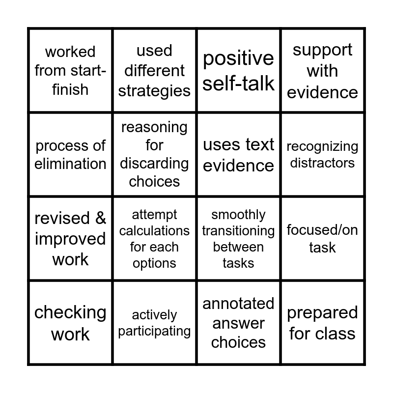 This bingo card has 16 words: actively participating, focused/on task, positive self-talk, worked from start-finish, revised & improved work, used different strategies, smoothly transitioning between tasks, annotated answer choices, process of elimination, reasoning for discarding choices, checking work, support with evidence, attempt calculations for each options, recognizing distractors, uses text evidence and prepared for class.