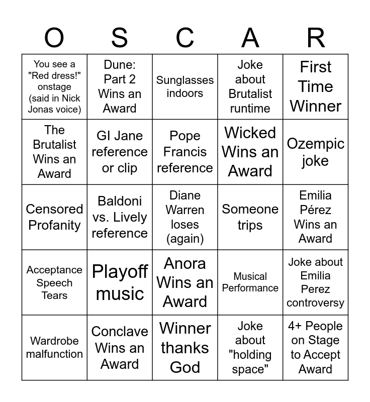 This bingo card has a free space and 29 words: Wardrobe malfunction, Winner is not present, Baldoni vs. Lively reference, You've seen a winning movie, You see a "Red dress!" onstage (said in Nick Jonas voice), Sunglasses indoors, GI Jane reference or clip, Playoff music, Someone trips, Conclave Wins an Award, Emilia Pérez Wins an Award, 4+ People on Stage to Accept Award, Winner thanks God, Joke about "holding space", Ozempic joke, Winner reads from phone, Anora Wins an Award, Acceptance Speech Tears, First Time Winner, Censored Profanity, Musical Performance, Shoutout to firefighters, Wicked Wins an Award, The Brutalist Wins an Award, Joke about Brutalist runtime, Dune: Part 2 Wins an Award, Joke about Emilia Perez controversy, Pope Francis reference and Trailer for new Disney movie.