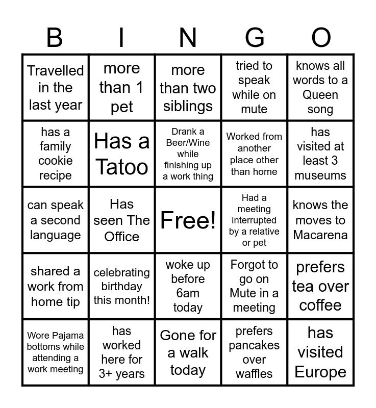 This bingo card has a free space and 24 words: celebrating birthday this month!, has worked here for 3+ years, Drank a Beer/Wine while finishing up a work thing, Wore Pajama bottoms while attending a work meeting, knows all words to a Queen song, Travelled in the last year, has a family cookie recipe, more than 1 pet, Had a meeting interrupted by a relative or pet, woke up before 6am today, Worked from another place other than home, can speak a second language, Forgot to go on Mute in a meeting, prefers tea over coffee, Has a Tatoo, prefers pancakes over waffles, knows the moves to Macarena, more than two siblings, has visited at least 3 museums, Has seen The Office, has visited Europe, shared a work from home tip, tried to speak while on mute and Gone for a walk today.