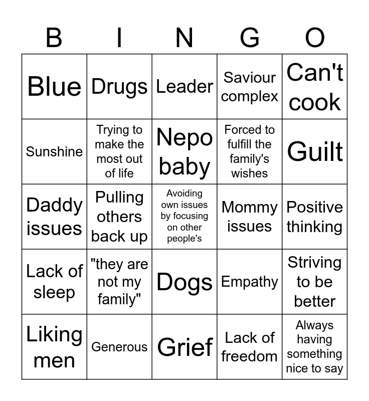 This bingo card has 25 words: "they are not my family", Grief, Nepo baby, Liking men, Can't cook, Blue, Sunshine, Drugs, Mommy issues, Dogs, Forced to fulfill the family's wishes, Daddy issues, Empathy, Striving to be better, Trying to make the most out of life, Always having something nice to say, Positive thinking, Leader, Guilt, Pulling others back up, Avoiding own issues by focusing on other people's, Generous, Lack of sleep, Saviour complex and Lack of freedom.