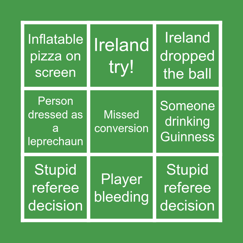 ⚠ This card has duplicate items: Ireland dropped the ball (2), Player bleeding (2), Stupid referee decision (2), Person dressed as a leprechaun (2)