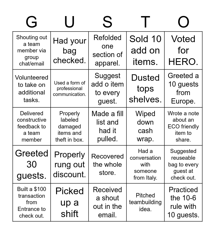 This bingo card has 40 words: Suggesting bean keychain to every guest., Properly labeled damaged items and theft in box., Completed tasks that was not assigned to you., Had a conversation with someone from Italy., Practiced the 10-6 rule with 10 guests., Delivered constructive feedback to a team member, Used a form of professional communication., Helped beat daily goal., Dusted tops shelves., Suggested reuseable bag to every guest at check out., Shouting out a team member via group chat/email, Had your bag checked., Made a fill list and had it pulled., Pitched teambuilding idea., Wrote a note about an ECO friendly item to share., Volunteered to take on additional tasks., Register wasn't short or over., Refolded one section of apparel., Checked everything is marked the right size., Voted for HERO., Greeted 30 guests., Picked up a shift, Suggest add o item to every guest., Wiped down cash wrap., Actively participating in teambuilding activities., Greeted 40 guests., Checked team members bag., Filled understock, Lint rolled all maniquins., Had a professional conversation with one of the partner companies., Suggest sticker to every guest., Properly rung out discount., Recovered the whole store., Restacked all folded apparel., Greeted a 10 guests from Europe., Built a $100 transaction from Entrance to check out., Showed up on time every shift in the week., Received a shout out in the email., Sold 10 add on items. and Suggested ECO friendly product to 10 guests..