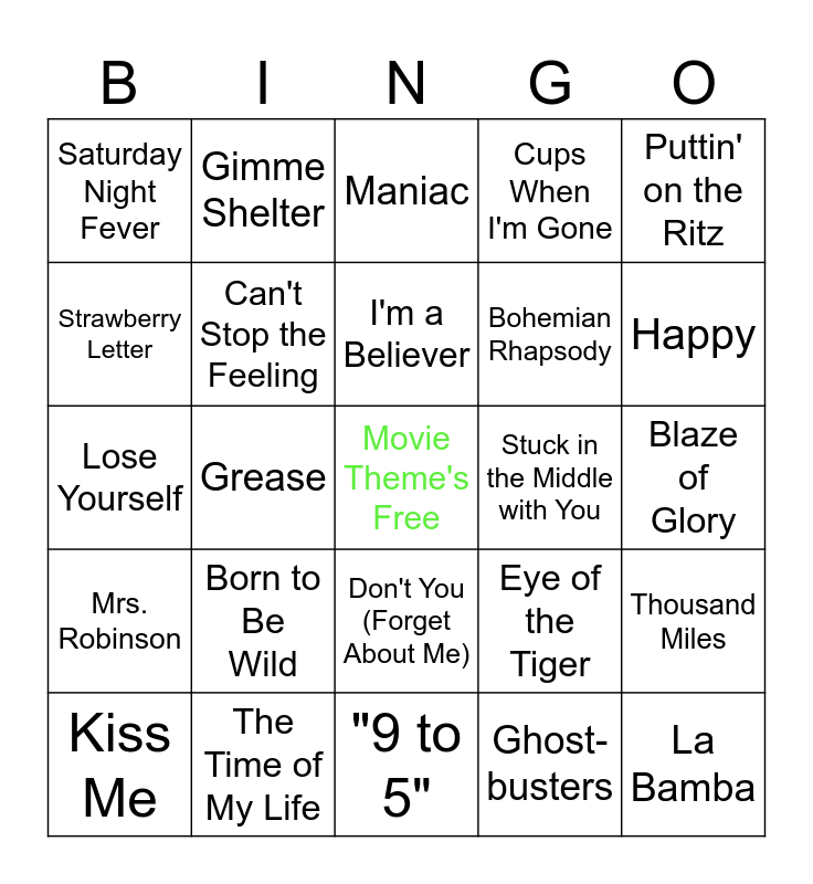 This bingo card has a free space and 30 words: The Time of My Life, Let's Go Crazy, Grease, Footloose, Saturday Night Fever, Maniac, Can't Stop the Feeling, Don't You (Forget About Me), Stuck in the Middle with You, "9 to 5", Blaze of Glory, La Bamba, Ghost-busters, The Power of Love, Happy, Sunflower, Eye of the Tiger, Mrs. Robinson, Born to Be Wild, Puttin' on the Ritz, Lose Yourself, Old Time Rock n Roll, Gimme Shelter, Bohemian Rhapsody, Strawberry Letter, Cups When I'm Gone, Thousand Miles, Kiss Me, I'm a Believer and Dueling Banjos.