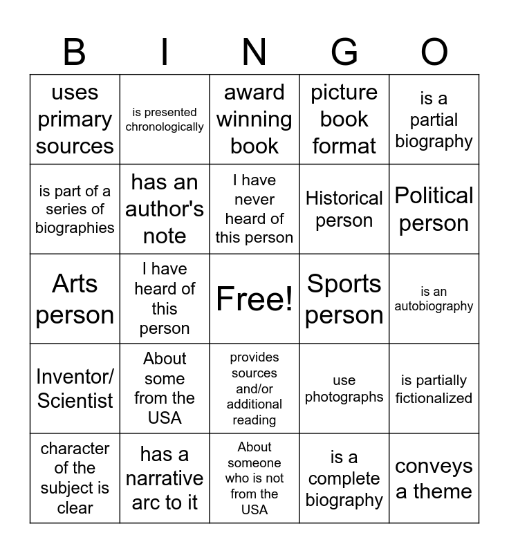 This bingo card has a free space and 24 words: About some from the USA, has a narrative arc to it, I have never heard of this person, character of the subject is clear, is a partial biography, uses primary sources, is part of a series of biographies, is presented chronologically, Sports person, provides sources and/or additional reading, Historical person, Arts person, use photographs, is partially fictionalized, has an author's note, is a complete biography, is an autobiography, award winning book, Political person, I have heard of this person, conveys a theme, Inventor/ Scientist, picture book format and About someone who is not from the USA.
