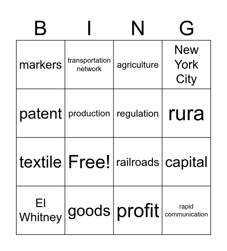 This bingo card has 16 words: goods, capital, agriculture, markers, textile, transportation network, railroads, profit, patent, production, El Whitney, New York City, Free!, rura, regulation and rapid communication.