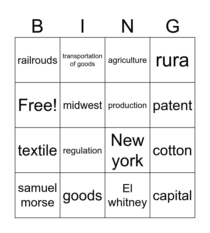 This bingo card has 16 words: goods, cotton, agriculture, railrouds, textile, transportation of goods, New york, El whitney, Free!, midwest, samuel morse, rura, regulation, patent, production and capital.
