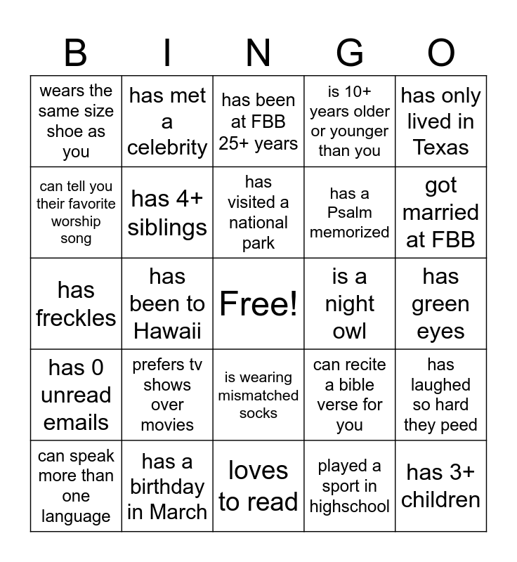 This bingo card has a free space and 34 words: was born in another country, played a sport in highschool, has read the entire bible, doesn't like coffee, has 0 unread emails, has 4+ siblings, has only lived in Texas, can speak more than one language, has met a celebrity, has never broken a bone, has visited a national park, has been at FBB 25+ years, owns a buisness, is left handed, is a night owl, got married at FBB, has a birthday in March, has freckles, prefers tv shows over movies, can recite a bible verse for you, is wearing mismatched socks, plays an instrument, wears the same size shoe as you, has green eyes, loves to read, has 3+ children, is 10+ years older or younger than you, has been married 20+ years, has a Psalm memorized, can tell you their favorite worship song, has 3+ pets, has been to Hawaii, has laughed so hard they peed and is related to someone else here.