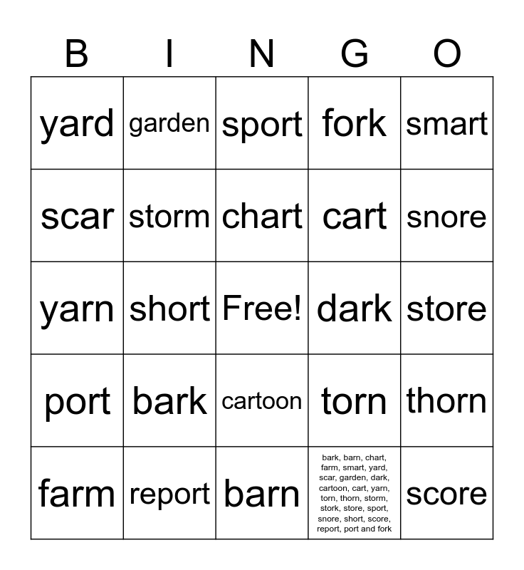 This bingo card has a free space and 25 words: bark, barn, chart, farm, smart, yard, scar, garden, dark, cartoon, cart, yarn, torn, thorn, storm, stork, store, sport, snore, short, score, report, port, fork and bark, barn, chart, farm, smart, yard, scar, garden, dark, cartoon, cart, yarn, torn, thorn, storm, stork, store, sport, snore, short, score, report, port and fork.