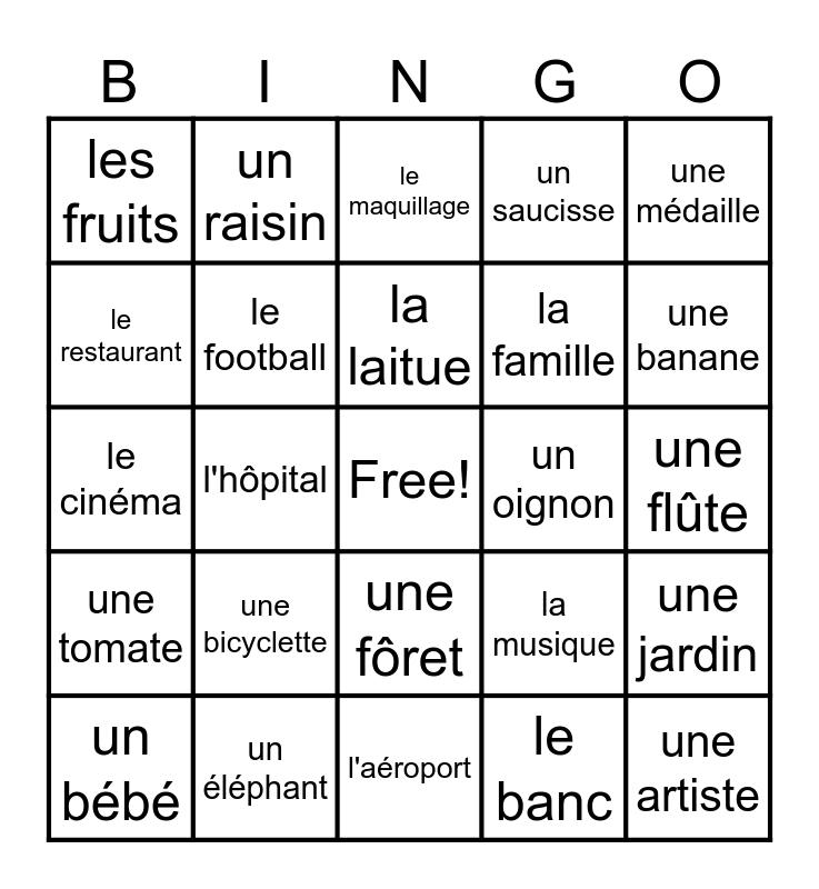 This bingo card has a free space and 29 words: un bébé, un pantalon, l'hôpital, le chocolat, les fruits, le maquillage, le football, une bicyclette, un oignon, un éléphant, une flûte, une artiste, l'aéroport, le banc, une banane, la pizza, une fôret, une tomate, une médaille, le cinéma, la musique, une pêche, la famille, le restaurant, un saucisse, un raisin, une jardin, la laitue and le thé.