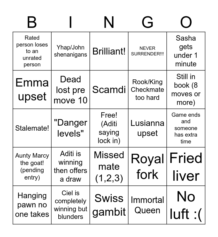 This bingo card has a free space and 24 words: Aditi is winning then offers a draw, Ciel is completely winning but blunders, Scamdi, Hanging pawn no one takes, Sasha gets under 1 minute, Rated person loses to an unrated person, Emma upset, Yhap/John shenanigans, Lusianna upset, Missed mate (1,2,3), Rook/King Checkmate too hard, Stalemate!, Royal fork, Fried liver, Dead lost pre move 10, Immortal Queen, Game ends and someone has extra time, Brilliant!, Still in book (8 moves or more), "Danger levels", No luft :(, Aunty Marcy the goat! (pending entry), NEVER SURRENDER!!! and Swiss gambit.