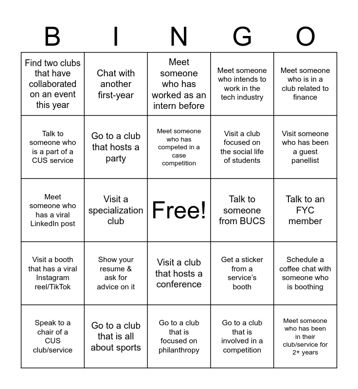 This bingo card has a free space and 24 words: Show your resume & ask for advice on it, Go to a club that is all about sports, Meet someone who has competed in a case competition, Speak to a chair of a CUS club/service, Meet someone who is in a club related to finance, Find two clubs that have collaborated on an event this year, Talk to someone who is a part of a CUS service, Chat with another first-year, Talk to someone from BUCS, Visit a club that hosts a conference, Visit a club focused on the social life of students, Meet someone who has a viral LinkedIn post, Get a sticker from a service’s booth, Schedule a coffee chat with someone who is boothing, Go to a club that hosts a party, Go to a club that is involved in a competition, Talk to an FYC member, Meet someone who has worked as an intern before, Visit someone who has been a guest panellist, Visit a specialization club, Meet someone who has been in their club/service for 2+ years, Visit a booth that has a viral Instagram reel/TikTok, Meet someone who intends to work in the tech industry and Go to a club that is focused on philanthropy.