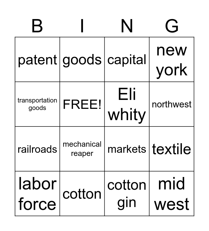 This bingo card has 16 words: cotton, textile, capital, patent, railroads, goods, markets, cotton gin, transportation goods, FREE!, labor force, new york, mechanical reaper, northwest, Eli whity and mid west.