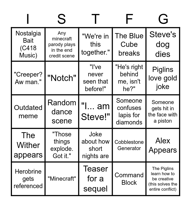 This bingo card has a free space and 24 words: "Those things explode. Got it.", "Minecraft", "I've never seen that before!", Herobrine gets referenced, Steve's dog dies, Nostalgia Bait (C418 Music), "Creeper? Aw man.", Any minecraft parody plays in the end credit scene, Someone confuses lapis for diamonds, Joke about how short nights are, "He's right behind me, isn't he?", Outdated meme, Cobblestone Generator, Alex Appears, "Notch", Command Block, Someone gets hit in the face with a piston, "We're in this together.", Piglins love gold joke, Random dance scene, The Piglins learn how to be creative (this solves the entire conflict), The Wither appears, The Blue Cube breaks and Teaser for a sequel.