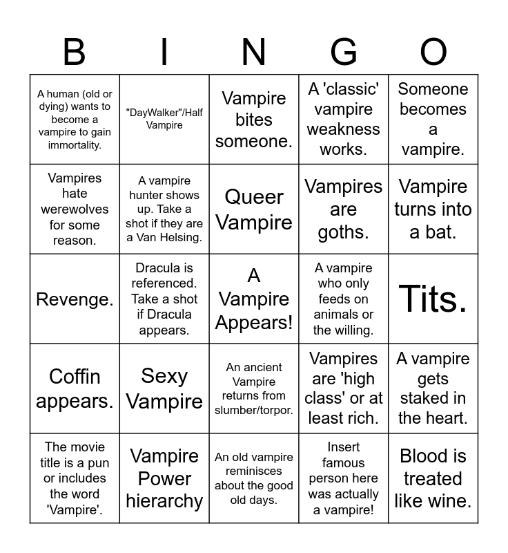 This bingo card has a free space and 48 words: Someone remarks how things "aren't like the movies or books", Blood is treated like wine., The vampire rules are super different., An old vampire reminisces about the good old days., Sexy Vampire, Vampires have a different name, like Kindred or Fangjob, "DayWalker"/Half Vampire, Vampire burns in sunlight onscreen., Vampires hate werewolves for some reason., Hideous Vampire, A vampire hunter shows up. Take a shot if they are a Van Helsing., A 'classic' vampire weakness works., A vampire gets staked in the heart., Vampires are 'high class' or at least rich., A nonstandard Vampire power is used., Forbidden vampire/human love., Queer Vampire, A vampire who only feeds on animals or the willing., Fangs are hidden then revealed., Someone becomes a vampire., Dracula is referenced. Take a shot if Dracula appears., Insert famous person here was actually a vampire!, A human (old or dying) wants to become a vampire to gain immortality., Vampires are goths., The movie is a period piece - the future counts., Vampire turns into a bat., The movie title is a pun or includes the word 'Vampire'., Erotic blood play is performed., An ancient Vampire returns from slumber/torpor., Coffin appears., No reflection/Not in pictures, Vampire nightclub, Special colored eyes, Vampires are hundreds of years old., Vampire Power hierarchy, Synthetic blood., Vampires have accents., Tits., Tragic backstory., UV bullets., Vampire dies., Betrayal., Vampire bites someone., Vampire Sympathizer, Revenge., Bela Lugosi Sit Up, A vampire "saves" a human by turning them. and Strategic sunbeam.