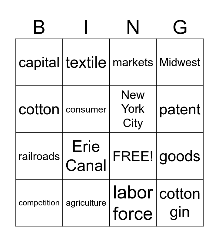 This bingo card has 16 words: agriculture, goods, markets, capital, railroads, textile, FREE!, labor force, cotton, consumer, competition, Midwest, Erie Canal, patent, New York City and cotton gin.
