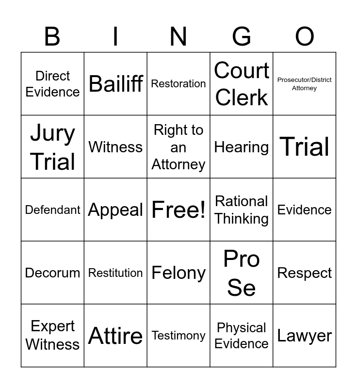 This bingo card has a free space and 77 words: Competency, Incompetent to Proceed (ITP), Restoration, Fourth Amendment, Warrant, Search & Seizure, Exclusionary Rule, Fifth Amendment, Self-Incrimination, Due Process of Law, Miranda Warning, Sixth Amendment, Right to an Attorney, Jury Trial, Speedy Trial, Appeal, Eighth Amendment, Lawyer, Defense Attorney/Public Defender, Prosecutor/District Attorney, Judge, Defendant, Witness, Bailiff, Court Clerk, Court Reporter, Jury, Verdict, Guilty Verdict, Not Guilty Verdict, Attorney-Client Privilege, Confidentiality, Collaborate, Pro Se, Trial, Hearing, Burden of Proof, Charge, Evidence, Physical Evidence, Witness Statement, Hearsay Testimony, Alibi, Eye-Witness, Alibi Witness, Character Witness, Expert Witness, Direct Evidence, Circumstantial Evidence, Confession, Misdemeanor, Felony, Sentence, Guilty Plea, Not Guilty Plea, No Contest, Not Guilty by Reason of Insanity (NGRI), Acquittal, Dismissed, Probation, Restitution, Fine, Hospital Commitment, Deferred Sentence, Suspended Sentence, Plea Bargain, Legal/Defense Strategy, Rational Thinking, Reality Orientation, Fact, Fiction, Respect, Decorum, Attire, Testify, Testimony and Truthful.