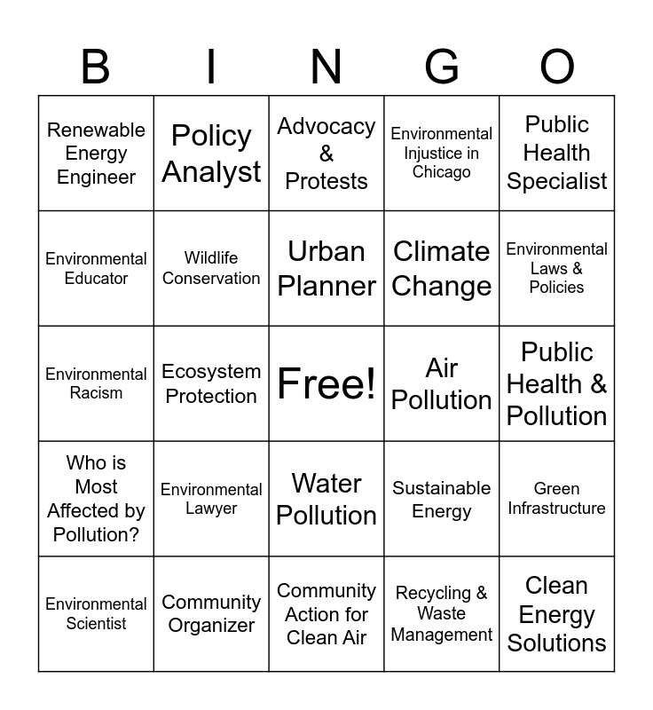 This bingo card has a free space and 24 words: Environmental Lawyer, Community Organizer, Urban Planner, Environmental Scientist, Public Health Specialist, Renewable Energy Engineer, Environmental Educator, Policy Analyst, Air Pollution, Water Pollution, Climate Change, Environmental Racism, Sustainable Energy, Green Infrastructure, Wildlife Conservation, Recycling & Waste Management, Public Health & Pollution, Advocacy & Protests, Environmental Laws & Policies, Ecosystem Protection, Clean Energy Solutions, Who is Most Affected by Pollution?, Environmental Injustice in Chicago and Community Action for Clean Air.