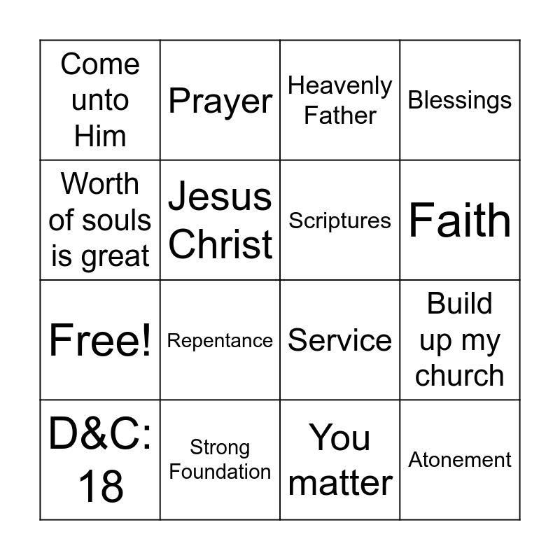 This bingo card has 20 words: Build up my church, Testimony, Heavenly Father, Steady Effort, D&C: 18, Worth of souls is great, Strong Foundation, Come unto Him, Free!, Prayer, Repentance, Service, Jesus Christ, Atonement, Scriptures, Humble and meek, Faith, Blessings, You matter and The One.