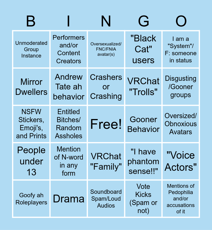 This bingo card has a free space and 24 words: Mention of N-word in any form, Drama, Crashers or Crashing, Goofy ah Roleplayers, I am a "System"/ F: someone in status, Unmoderated Group Instance, Mirror Dwellers, Performers and/or Content Creators, Gooner Behavior, VRChat "Family", VRChat "Trolls", NSFW Stickers, Emoji's, and Prints, "I have phantom sense!!", "Voice Actors", Andrew Tate ah behavior, Vote Kicks (Spam or not), Oversized/ Obnoxious Avatars, Oversexualized/ FNC/FNIA avatar(s), Disgusting /Gooner groups, Entitled Bitches/ Random Assholes, Mentions of Pedophilia and/or accusations of it, People under 13, "Black Cat" users and Soundboard Spam/Loud Audios.
