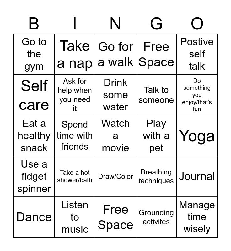 This bingo card has a free space and 24 words: Take a hot shower/bath, Listen to music, Drink some water, Dance, Postive self talk, Go to the gym, Self care, Take a nap, Play with a pet, Draw/Color, Talk to someone, Eat a healthy snack, Breathing techniques, Journal, Ask for help when you need it, Grounding activites, Yoga, Go for a walk, Do something you enjoy/that's fun, Spend time with friends, Manage time wisely, Use a fidget spinner, Free Space and Free Space.