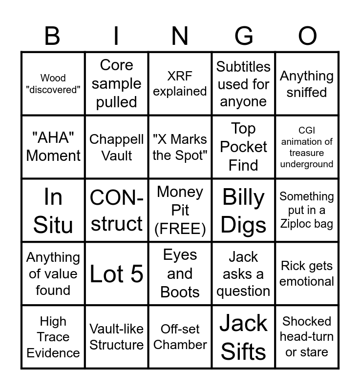 This bingo card has a free space and 24 words: Lot 5, Vault-like Structure, "X Marks the Spot", High Trace Evidence, Anything sniffed, Wood "discovered", "AHA" Moment, Core sample pulled, Billy Digs, Eyes and Boots, Top Pocket Find, In Situ, Jack asks a question, Rick gets emotional, Chappell Vault, Jack Sifts, Something put in a Ziploc bag, XRF explained, CGI animation of treasure underground, CON-struct, Shocked head-turn or stare, Anything of value found, Subtitles used for anyone and Off-set Chamber.