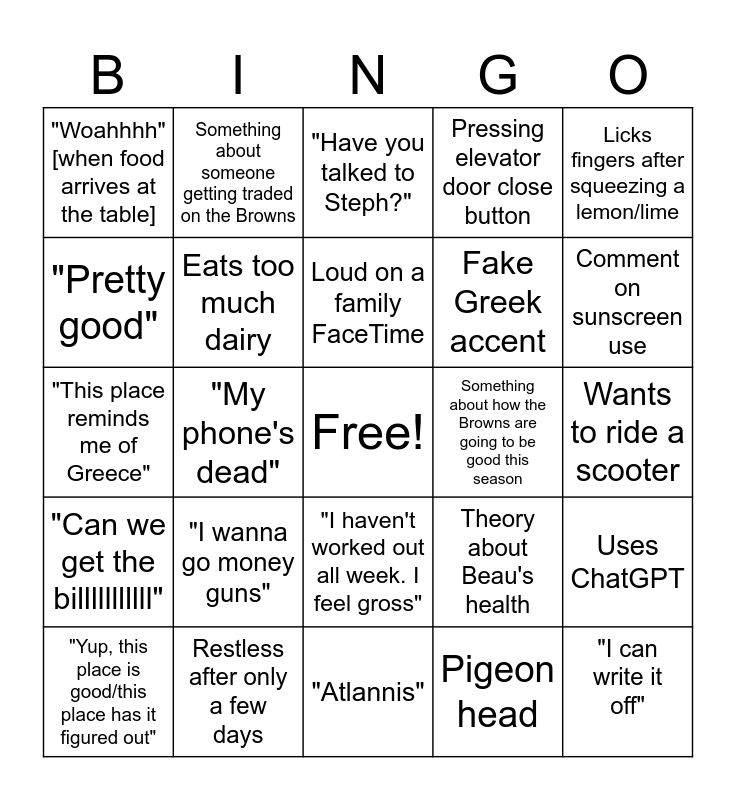 This bingo card has a free space and 24 words: "I wanna go money guns", Restless after only a few days, Loud on a family FaceTime, "Yup, this place is good/this place has it figured out", Licks fingers after squeezing a lemon/lime, "Woahhhh" [when food arrives at the table], "Pretty good", Something about someone getting traded on the Browns, Something about how the Browns are going to be good this season, "I haven't worked out all week. I feel gross", Fake Greek accent, "This place reminds me of Greece", Theory about Beau's health, Uses ChatGPT, Eats too much dairy, Pigeon head, Wants to ride a scooter, "Have you talked to Steph?", Comment on sunscreen use, "My phone's dead", "I can write it off", "Can we get the billlllllllll", Pressing elevator door close button and "Atlannis".