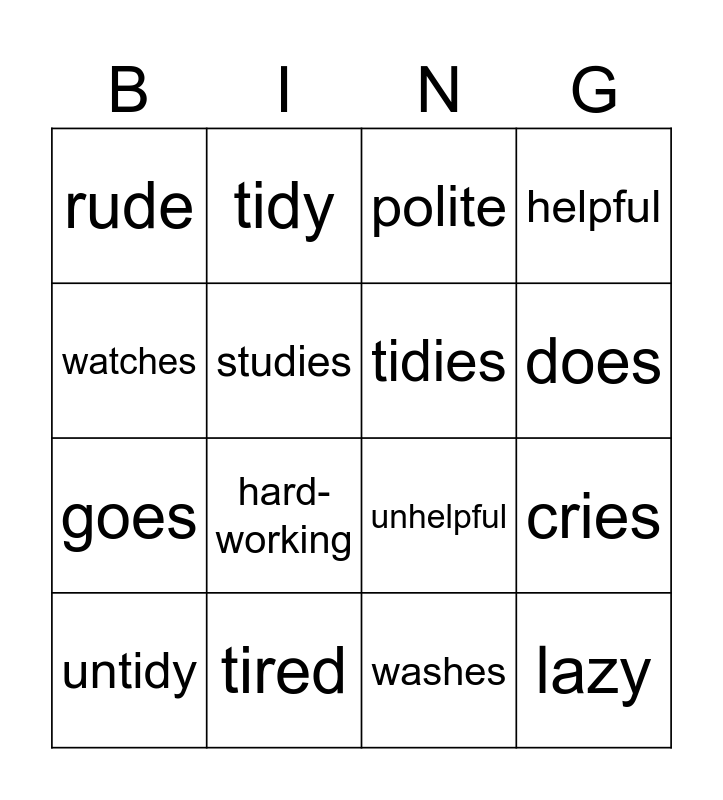 This bingo card has 18 words: hard-working, lazy, polite, rude, unhelpful, helpful, untidy, tidy, does, goes, washes, watches, cries, studies, tidies, plays, tired and busy.