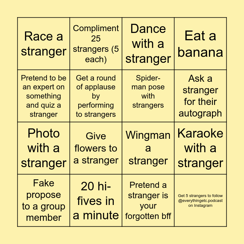 This bingo card has 16 words: 20 hi-fives in a minute, Karaoke with a stranger, Dance with a stranger, Race a stranger, Photo with a stranger, Compliment 25 strangers (5 each), Wingman a stranger, Pretend a stranger is your forgotten bff, Pretend to be an expert on something and quiz a stranger, Get a round of applause by performing to strangers, Fake propose to a group member, Eat a banana, Give flowers to a stranger, Ask a stranger for their autograph, Spider-man pose with strangers and Get 5 strangers to follow @everythingetc.podcast on Instagram.
