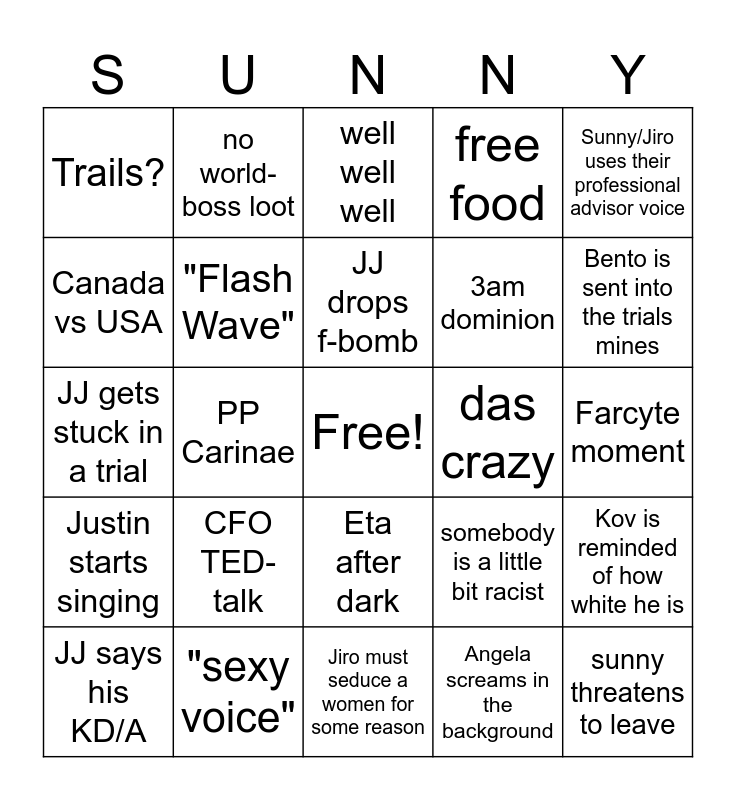 This bingo card has a free space and 24 words: JJ says his KD/A, CFO TED-talk, JJ drops f-bomb, Angela screams in the background, Sunny/Jiro uses their professional advisor voice, Trails?, no world-boss loot, well well well, das crazy, Farcyte moment, JJ gets stuck in a trial, "Flash Wave", somebody is a little bit racist, Kov is reminded of how white he is, Canada vs USA, "sexy voice", Jiro must seduce a women for some reason, free food, Bento is sent into the trials mines, Justin starts singing, PP Carinae, Eta after dark, 3am dominion and sunny threatens to leave.