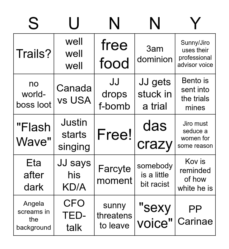 This bingo card has a free space and 24 words: JJ says his KD/A, CFO TED-talk, JJ drops f-bomb, Angela screams in the background, Sunny/Jiro uses their professional advisor voice, Trails?, no world-boss loot, well well well, das crazy, Farcyte moment, JJ gets stuck in a trial, "Flash Wave", somebody is a little bit racist, Kov is reminded of how white he is, Canada vs USA, "sexy voice", Jiro must seduce a women for some reason, free food, Bento is sent into the trials mines, Justin starts singing, PP Carinae, Eta after dark, 3am dominion and sunny threatens to leave.