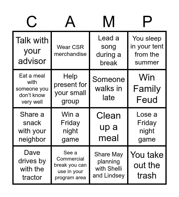This bingo card has 25 words: Free!, Frank participates in an activity, Win Family Feud, Lose Family Feud, Eat a meal with someone you don’t know very well, Talk with your advisor, Help present for your small group, Wear CSR merchandise, See a Commercial break you can use in your program area, Serve a meal, Share a snack with your neighbor, Clean up a meal, Tommy tells a lie, Remarkable is used, Someone walks in late, Say grace before meal, Share May planning with Shelli and Lindsey, Lead a song during a break, Win a Friday night game, Lose a Friday night game, Dave drives by with the tractor, You don't drink the sweet tea, You take out the trash, You sleep in your tent from the summer and Woody calls seconds.