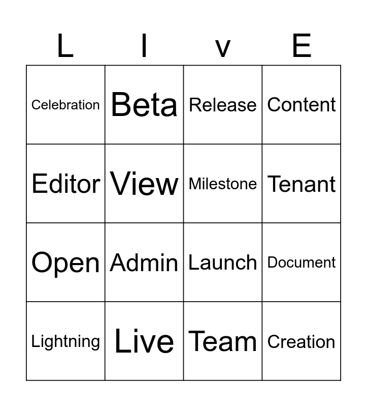 This bingo card has 16 words: Live, Document, Release, Celebration, Open, Beta, Launch, Team, Editor, View, Lightning, Content, Admin, Tenant, Milestone and Creation.