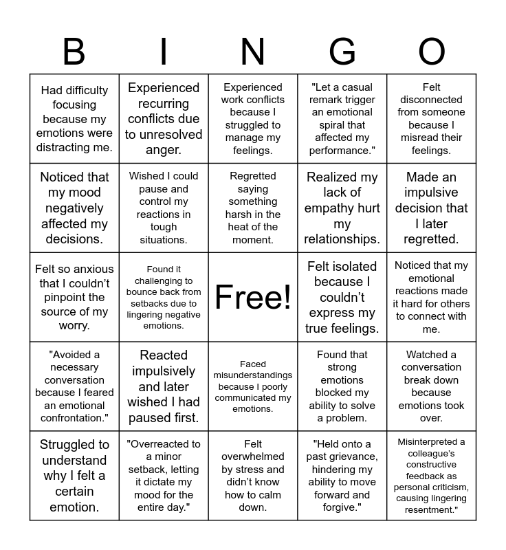 This bingo card has a free space and 25 words: Reacted impulsively and later wished I had paused first., Felt overwhelmed by stress and didn’t know how to calm down., Regretted saying something harsh in the heat of the moment., Struggled to understand why I felt a certain emotion., Felt disconnected from someone because I misread their feelings., Had difficulty focusing because my emotions were distracting me., Noticed that my mood negatively affected my decisions., Experienced recurring conflicts due to unresolved anger., Felt isolated because I couldn’t express my true feelings., Faced misunderstandings because I poorly communicated my emotions., Realized my lack of empathy hurt my relationships., Felt so anxious that I couldn’t pinpoint the source of my worry., Found that strong emotions blocked my ability to solve a problem., Watched a conversation break down because emotions took over., Wished I could pause and control my reactions in tough situations., Felt drained after an emotionally charged interaction., Noticed that my emotional reactions made it hard for others to connect with me., Experienced work conflicts because I struggled to manage my feelings., Made an impulsive decision that I later regretted., Found it challenging to bounce back from setbacks due to lingering negative emotions., Misinterpreted a colleague’s constructive feedback as personal criticism, causing lingering resentment.", "Overreacted to a minor setback, letting it dictate my mood for the entire day.", "Avoided a necessary conversation because I feared an emotional confrontation.", "Let a casual remark trigger an emotional spiral that affected my performance." and "Held onto a past grievance, hindering my ability to move forward and forgive.".