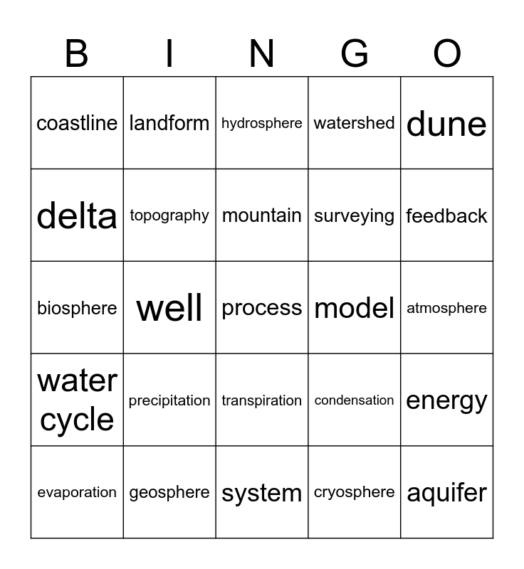 This bingo card has 25 words: precipitation, system, mountain, evaporation, dune, coastline, delta, landform, model, transpiration, surveying, biosphere, condensation, energy, topography, aquifer, atmosphere, hydrosphere, feedback, well, process, geosphere, water cycle, watershed and cryosphere.