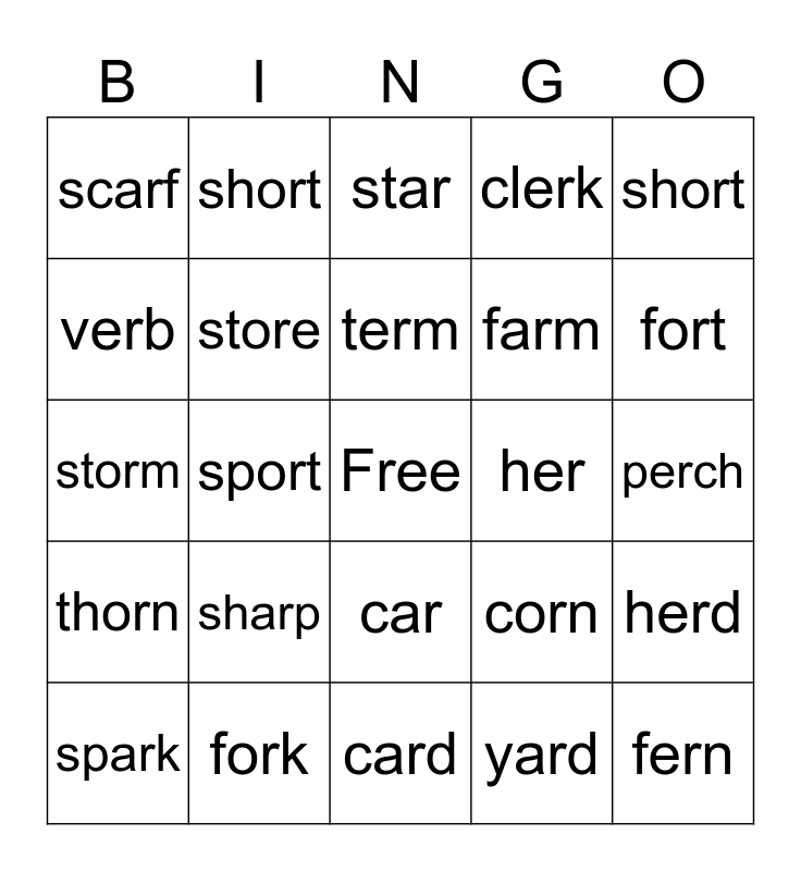 This bingo card has a free space and 24 words: sharp, fork, term, spark, short, scarf, verb, short, her, car, farm, storm, corn, herd, store, yard, perch, star, fort, sport, fern, thorn, clerk and card.