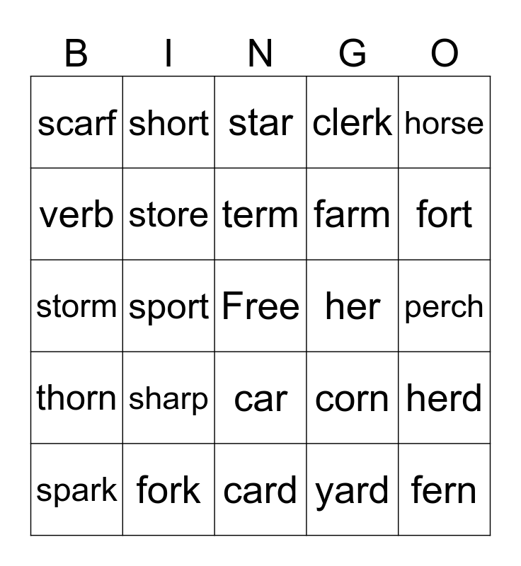 This bingo card has a free space and 24 words: sharp, fork, term, spark, horse, scarf, verb, short, her, car, farm, storm, corn, herd, store, yard, perch, star, fort, sport, fern, thorn, clerk and card.