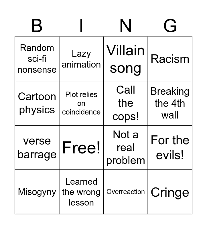 This bingo card has 18 words: Free!, Cringe, Villain song, Random sci-fi nonsense, Not a real problem, Racism, Misogyny, Lazy animation, Breaking the 4th wall, verse barrage, Overreaction, Cartoon physics, For the evils!, Plot relies on coincidence, Call the cops!, Authorities are useless, Learned the wrong lesson and Transformation sequence.