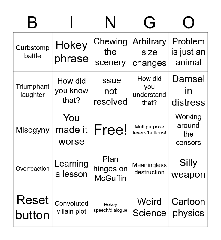 This bingo card has a free space and 40 words: Colour bleed, Misogyny, Racism, How did you know that?, Convoluted villain plot, Plan hinges on McGuffin, Issue not resolved, Problem is hero/bystander fault, Problem is just an animal, Overreaction, You made it worse, Arbitrary size changes, Cartoon physics, Working around the censors, Multipurpose levers/buttons!, Learning a lesson, Hero sadism, Curbstomp battle, Arbitrary stupidity, Chewing the scenery, Silly weapon, Weird Science, How did you understand that?, Triumphant laughter, Obvious political commentary, Ancient secrets, Animal mascot hijinks, Hidden villain/sudden betrayal, Evil face, Explains the plan, Universal experts, Reset button, Authorities are useless, Meaningless destruction, Damsel in distress, Hokey speech/dialogue, All your eggs in one McGuffin, racism, Hokey phrase and What are you armed with?.