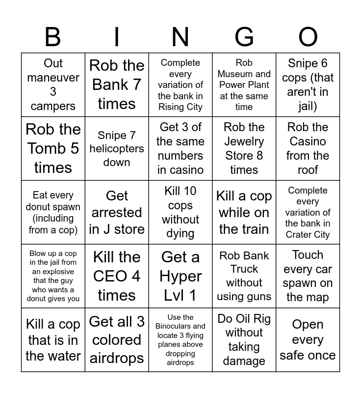 This bingo card has a free space and 24 words: Kill the CEO 4 times, Get all 3 colored airdrops, Get 3 of the same numbers in casino, Kill a cop that is in the water, Snipe 6 cops (that aren't in jail), Out maneuver 3 campers, Rob the Tomb 5 times, Rob the Bank 7 times, Kill a cop while on the train, Get a Hyper Lvl 1, Rob the Jewelry Store 8 times, Eat every donut spawn (including from a cop), Rob Bank Truck without using guns, Touch every car spawn on the map, Snipe 7 helicopters down, Do Oil Rig without taking damage, Complete every variation of the bank in Crater City, Complete every variation of the bank in Rising City, Rob the Casino from the roof, Get arrested in J store, Open every safe once, Blow up a cop in the jail from an explosive that the guy who wants a donut gives you, Rob Museum and Power Plant at the same time and Use the Binoculars and locate 3 flying planes above dropping airdrops.