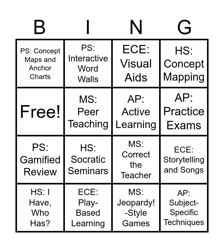 This bingo card has 16 words: ECE: Play-Based Learning, ECE: Storytelling and Songs, ECE: Visual Aids, PS: Concept Maps and Anchor Charts, PS: Gamified Review, PS: Interactive Word Walls, MS: Correct the Teacher, MS: Jeopardy! -Style Games, Free!, MS: Peer Teaching, HS: I Have, Who Has?, HS: Concept Mapping, HS: Socratic Seminars, AP: Practice Exams, AP: Active Learning and AP: Subject-Specific Techniques.