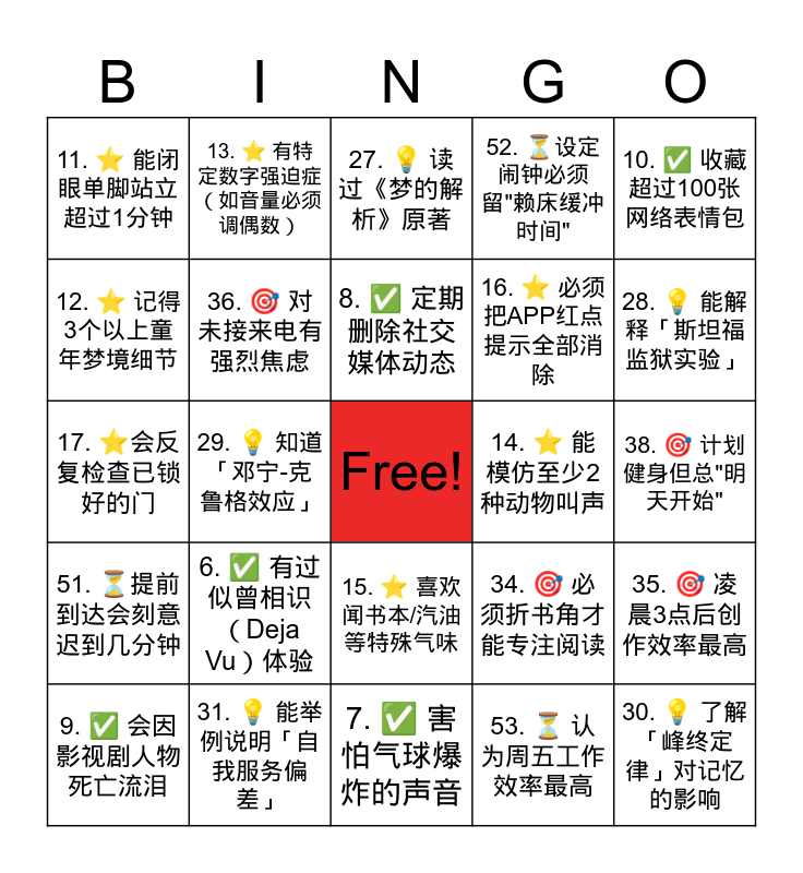 This bingo card has a free space and 25 words: 6. ✅ 有过似曾相识(Deja Vu)体验, 7. ✅ 害怕气球爆炸的声音, 8. ✅ 定期删除社交媒体动态, 9. ✅ 会因影视剧人物死亡流泪, 10. ✅ 收藏超过100张网络表情包, 11. ⭐ 能闭眼单脚站立超过1分钟, 12. ⭐ 记得3个以上童年梦境细节, 13. ⭐ 有特定数字强迫症(如音量必须调偶数), 14. ⭐ 能模仿至少2种动物叫声, 15. ⭐ 喜欢闻书本/汽油等特殊气味, 16. ⭐ 必须把APP红点提示全部消除, 17. ⭐会反复检查已锁好的门, 34. 🎯 必须折书角才能专注阅读, 35. 🎯 凌晨3点后创作效率最高, 36. 🎯 对未接来电有强烈焦虑, 37. 🎯 网购必看差评却依然购买, 38. 🎯 计划健身但总"明天开始", 27. 💡 读过《梦的解析》原著, 28. 💡 能解释「斯坦福监狱实验」, 29. 💡 知道「邓宁-克鲁格效应」, 30. 💡 了解「峰终定律」对记忆的影响, 31. 💡 能举例说明「自我服务偏差」, 51. ⏳提前到达会刻意迟到几分钟, 52. ⏳设定闹钟必须留"赖床缓冲时间" and 53. ⏳ 认为周五工作效率最高.