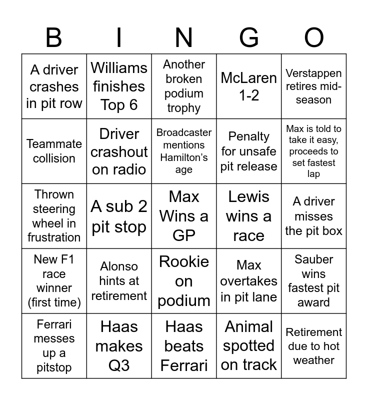 This bingo card has a free space and 24 words: Alonso hints at retirement, Haas makes Q3, Broadcaster mentions Hamilton’s age, Ferrari messes up a pitstop, Verstappen retires mid-season, A driver crashes in pit row, Teammate collision, Williams finishes Top 6, Lewis wins a race, Rookie on podium, Penalty for unsafe pit release, Thrown steering wheel in frustration, Max overtakes in pit lane, Sauber wins fastest pit award, Driver crashout on radio, Animal spotted on track, A driver misses the pit box, Another broken podium trophy, Max is told to take it easy, proceeds to set fastest lap, A sub 2 pit stop, Retirement due to hot weather, New F1 race winner (first time), McLaren 1-2 and Haas beats Ferrari.