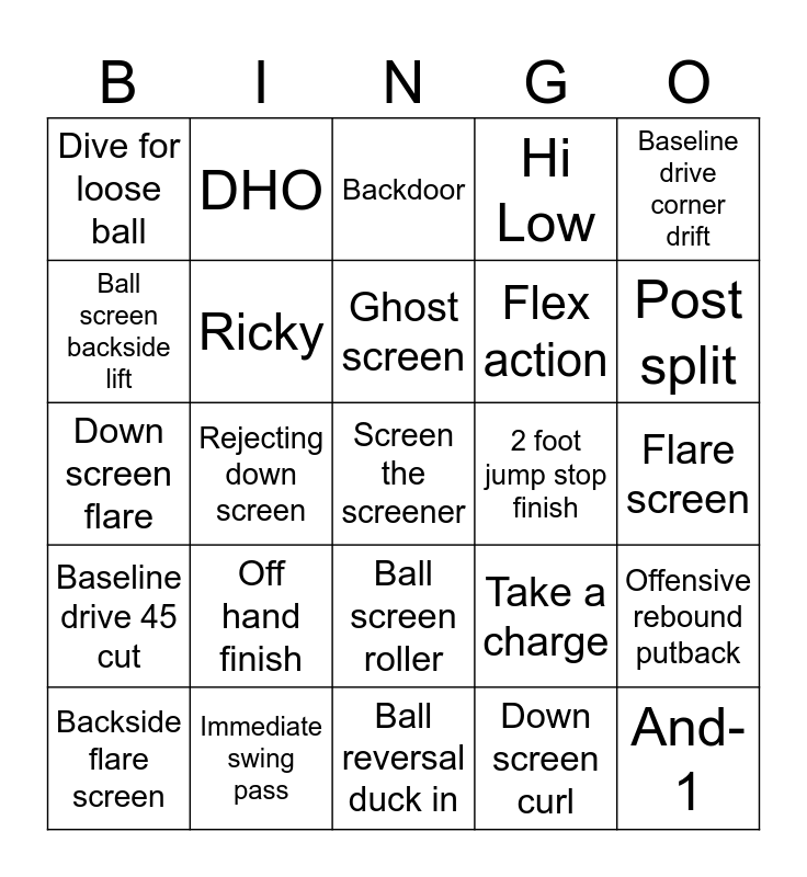 This bingo card has 25 words: Off hand finish, Ball reversal duck in, Ghost screen, Backside flare screen, Baseline drive corner drift, Dive for loose ball, Ball screen backside lift, DHO, 2 foot jump stop finish, Ball screen roller, Flex action, Down screen flare, Take a charge, Offensive rebound putback, Ricky, And-1, Flare screen, Backdoor, Post split, Rejecting down screen, Screen the screener, Immediate swing pass, Baseline drive 45 cut, Hi Low and Down screen curl.